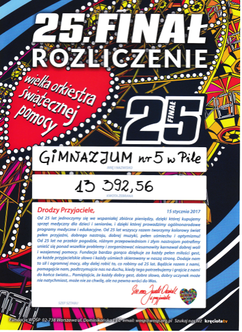 Z wielkim zadowoleniem przyjęliśmy potwierdzenie naszej udanej akcji w dniu 15 stycznia 2017 r. – zbiórka w szkole oraz kwesta wolontariuszy z naszej szkoły, którzy prowadzili zbiórkę na ulicach miasta przyniosła ponad 13000 złotych. Całą kwotę przekazaliśmy do pilskiego sztabu orkiestry w RCK. Tak jak cała Piła, my też pobiliśmy ubiegłoroczny rekord naszej szkoły, jednocześnie czując, że robimy coś ważnego. Nasza społeczność szkolna jest niezwykle dumna, że kolejny raz mogła być częścią tej wspaniałej akcji, niosącej pomoc tak wielu ludziom – i tym najmłodszym, i tym starszym. Dziękujemy zwłaszcza Rodzicom naszych uczniów i wszystkim wspaniałym osobom, które wspomogły naszą akcję.