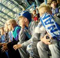 Niestety obie drużyny rozpoczęły zmagania punktualnie o 1800. Dlaczego niestety? Mecz Lecha z Arką cieszył się niezwykle dużym zainteresowaniem. Świadczył o tym ogromny korek dziesiątków autokarów na ulicach miasta i długie kolejki do wejść na stadion. To było przyczyną naszego spóźnienia. Mimo że nie udało nam się odśpiewać hymnu Kolejorza i zobaczyć początku zmagań naszej drużyny, to pozostałą część meczu dzielnie zagrzewaliśmy ją do walki.