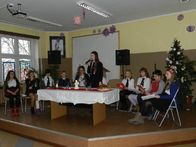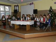 Zaproszeni goście otrzymali teksty kolęd, które były wspólnie śpiewane w czasie występów. Najpierw na scenie pojawiła się Julia, która zebranym gościom przypomniała, że Boże Narodzenie to święto rodzinne, sięgające tradycjami dawnych czasów. Następnie Ada zaprezentowała wiersz „Adwent głosi". Kolejnym punktem programu był występ Marcelego, mówiący o tradycjach wigilijnych kultywowanych na wsi. Po nim głos zabrała Weronika, pięknie recytując wiersz Ryszarda Mierzejewskiego „Przy stole betlejemskim". Następnie na scenę wyszła Angelika, która opowiedziała historię powstawania kolęd. Potem wszyscy razem zaśpiewaliśmy kolędę „Anioł pasterzom mówił" przy akompaniamencie Pana Graczyka. W dalszej części uroczystości wystąpiła Paulina, cudownie deklamując wiersz Stanisława Grochowiaka „Pastorałka". Kolejnym punktem programu był występ Martyny i Macieja. Oboje przybliżyli widzom historię związaną z choinką. Następnie Julia wraz z Małgosią opowiedziały ciekawostki o Św. Mikołaju. W końcowej części uroczystości uczniowie słuchali pięknych wierszy związanych ze zbliżającymi się świętami i wspólnie kolędowali. Na zakończenie Angelika i Ada złożyły wszystkim oglądającym życzenia bożonarodzeniowe.